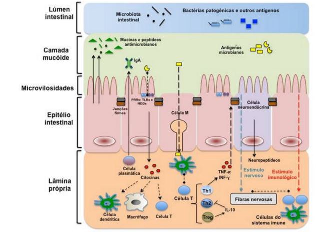 – Além dessas, existem outras barreiras por todo o corpo humano, como no trato digestivo, no qual podemos citar a saliva, que contém substâncias bactericidas e bacteriostáticas e o fluxo constante da saliva carrega as partículas para o estômago; o estômago que por seu pH baixo mata a maioria dos microrganismos; o intestino, no qual, apesar dos líquidos pancreáticos e biliares neutralizarem o pH, a flora normal abundante controla o desenvolvimento de microrganismos patogênicos. Além disso, a camada de muco e o peristaltismo também dificultam a instalação de patógenos. Há o trato geniturinário, no qual um dos exemplos é o fluxo da urina que arrasta as partículas e o pH ácido limita o crescimento de bactérias. E também a conjuntiva dos olhos, onde um possível exemplo é o constante fluxo de lágrimas arrasta os microrganismos para as fossas nasais (2).