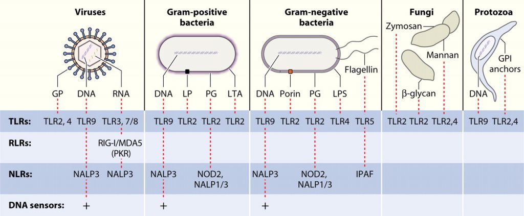 Nossa pele, os cílios do nariz e da traqueia, as lagrimas e as células de defesa como: macrófagos, neutrófilos, eosinófilos, mastócitos, basófilos, células dendríticas, células NK… todas essas células possuem receptores que irão reconhecer padrões – que são os chamados PAMPs –