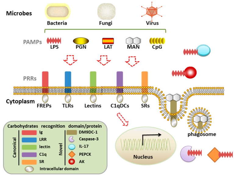 Como há dito, moléculas tais como lipopolissacarídeos, resíduos de manose e ácidos teicoicos, comumente encontradas na superfície de microorganismos, constituem PAMPs e ativam a resposta imune inata, por interação com diferentes receptores conhecidos como Receptores de Reconhecimento de Padrões, dentre os quais a família dos receptores Toll-like. Essa interação é semelhante à complementaridade entre antígeno e anticorpo ou entre antígeno e receptor de linfócitos T, mas, nesse caso, não há diversidade nem capacidade adaptativa para a geração de novos receptores ou reconhecimento de novos padrões moleculares que não aqueles já programados no código genético (4).